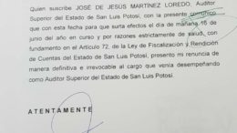 San Luis Potosí El auditor superior del estado José de Jesús Martínez Loredo entregó su renuncia por escrito al cargo…