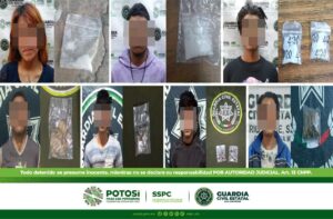 Durante los operativos de seguridad, en la colonia San Salvador, Luis “N” de 21 años de edad, fue detenido con una dosis de “cristal”; mientras que en la colonia Rural Atlas, Carlos “N” de 21 años, fue asegurado con dos dosis de “cristal”. En el municipio de Soledad de Graciano Sánchez, sobre la colonia San Francisco, resultó detenido Moisés “N” de 37 años de edad, con una dosis de marihuana; al igual que María “N” de 23 años, quien fue asegurada con una dosis de “cristal”.