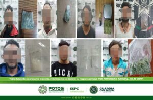 Al interior del Estado, en el municipio de Ciudad Valles, sobre Barrio Las Lomas, Gerardo “N” de 48 años de edad, resultó detenido con una dosis de marihuana; en la colonia Tipzén, José “N” de 24 años, fue detenido con una bolsa con marihuana; a su vez, en el fraccionamiento Norte Residencial, Juan “N” de 22 años, fue asegurado con dos dosis de marihuana; en el municipio de Ciudad Fernández, Juan “N” de 23 años, quedó detenido con una dosis de marihuana; en este mismo municipio, en la localidad Reforma, Reynaldo “N” de 25 años quedó detenido con una dosis de marihuana.