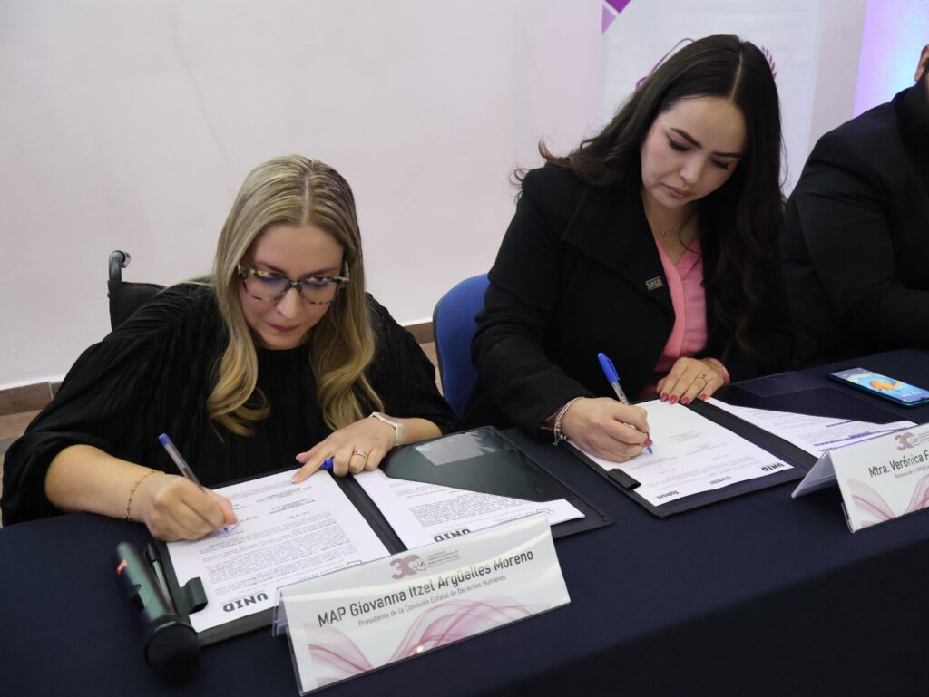 Con la participación de la comunidad escolar y de la Rectora de la Universidad Mtra. Verónica Félix Castañón, se firmó un convenio que permitirá al estudiantado y al personal docente y administrativo participar en acciones para la promoción y defensa de los derechos humanos, entre ellas la capacitación y desarrollo de proyectos conjuntos a favor de las juventudes del Estado.