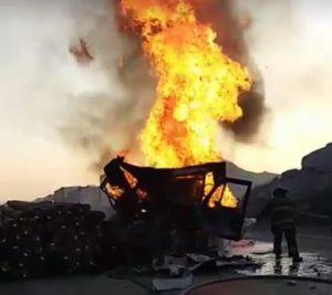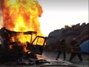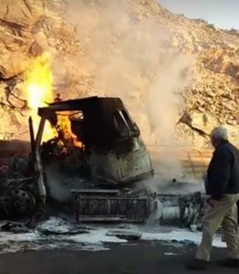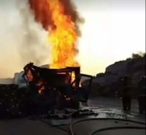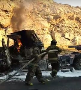 Debido al fuerte impacto, el tractor comenzó a incendiarse ello motivó a que su chofer saliera de inmediato y salvara la vida pues las llamas acabaron con la mole de acero.