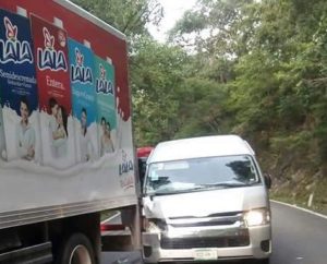 El accidente se produjo la tarde del martes en el kilometro 50 + 300 de la carretera 70 , que por las condiciones del pavimento mojado origino que una camioneta del servicio público chocara por alcance contra un camión repartidor de lacteos solo se registraron daños materiales y el cierre parcial de la carretera por varias horas.