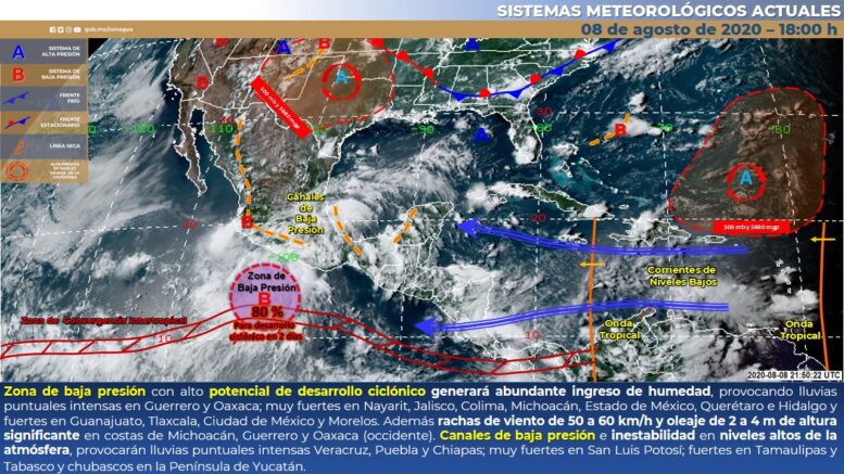Para esta noche y madrugada, una zona de baja presión con alto potencial de desarrollo ciclónico al sur de las costas de Guerrero,  generará abundante ingreso de humedad hacia el occidente, centro y sur del territorio nacional, provocando lluvias puntuales intensas en Jalisco, Guerrero y Oaxaca, además de lluvias muy fuertes en Nayarit, Colima, Michoacán, Estado de México, Querétaro e Hidalgo, así como fuertes en Guanajuato, Tlaxcala, Ciudad de México y Morelos, las cuales estarán acompañadas de actividad eléctrica, rachas de viento y posibles granizadas. Asimismo, se pronostican rachas de viento de 50 a 60 km/h y oleaje de 2 a 4 m de altura significante en costas de Michoacán, Guerrero y Oaxaca (occidente). Por otro lado, un canal de baja presión se extenderá a sobre la Sierra Madre Oriental, en interacción con inestabilidad en niveles altos de la atmósfera, provocará lluvias puntuales intensas en Veracruz y Puebla; muy fuertes en San Luis Potosí, así como fuertes en Tamaulipas. Un segundo canal de baja presiónsobre el sureste del país provocará lluvias puntuales intensas en Chiapas, fuertes en Tabasco e intervalos de chubascos en la Península de Yucatán, las lluvias se acompañarán de descargas eléctricas y rachas de viento de 50 km/h.