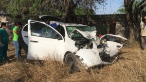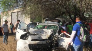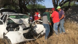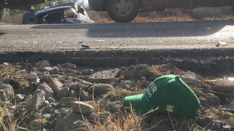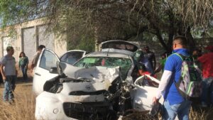El chofer de uno de los equipos de la avanzada del candidato Pollo” Gallardo circulaba a exceso de velocidad y al tratar de rebasar a otro vehículo chocó de frente contra una camioneta Ranger a unos metros de la entrada al camino de la comunidad de el Capulin a escaso un kilómetro del bulevar universitario en la zona urbana