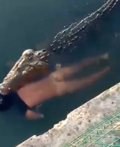 Cocodrilo pasea cadáver de un hombre en la Laguna del Carpintero en Tampico Tamaulipas, presuntamente el hombre ingresó a nadar a la laguna y fue atacado por el animal. imagenes fuertes en video