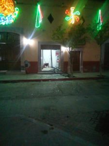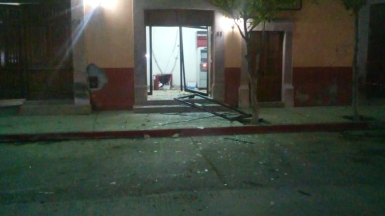 Los hechos se registraron por la madrugada ,8 sujetos armados y ocultos del rostro a bordo de una camioneta Silverado en color gris llegaron hasta un cajero automático BANORTE ubicado en la entrada de Palacio Municipal y procedieron a violentar el aparato con el uso de cadenas y cuerdas especiales para darse a la fuga .