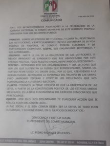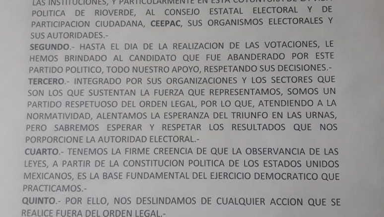 El presidente del comité municipal del PRI en Rioverde, Pedro Morales Sifuentes hizo llegar a zona potosina un oficio donde se el partido se deslinda de toda acción que se realice fuera del orden de la ley y condeno las acciones que hoy militantes de su partido realizaron en las oficinas del CEEPAC como de palacio municipal asegurando que la paz social y el bien común debe de ser la divisa de todo buen ciudadano, y su honestidad , el ejercicio democrático.