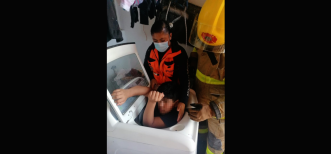 Al percatarse que el menor había quedado atascado al interior de la lavadora, la familia solicitó apoyo al número de emergencias 911.