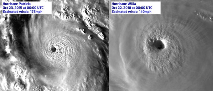 Este fin de semana, el Servicio Meteorológico Nacional compartió en Twitter fotografías que comparan a Willa con Patricia, otro poderoso ciclón que tocó territorio mexicano en 2015.