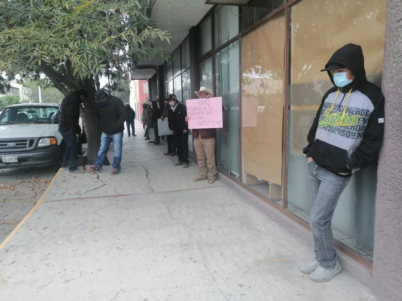 Con cartulinas los comuneros que se dicen validados por el Tribunal Colegiado del Noveno Circuito con el expediente 513/2015, pese a las bajas temperaturas de hasta tres grados centígrados, se apostaron a la entrada del RAN en la esquina que forman las calles Juan de Oñate y SCOP donde colocaron dos enormes mantas plastificadas donde exigen se declaren nulos los registros catastrales expedidos en favor de la C. María Dolores Bravo Montalvo con los que ha podido vender en cantidades millonarias las tierras que, dicen, les pertenecen a los sucesores consanguíneos de la Resolución Presidencial de 1929.