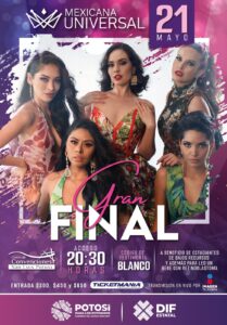 A las y los potosinos y a México entero, los invitó a ser testigos de la gran final del concurso este próximo 21 de mayo, asistir y adquirir sus boletos de entrada con causa social y altruista, o por medio de la transmisión televisa, pero sobre todo ser conscientes y contribuir a mejorar las condiciones sociales actuales de las mujeres mexicanas en todos los rubros de participación.