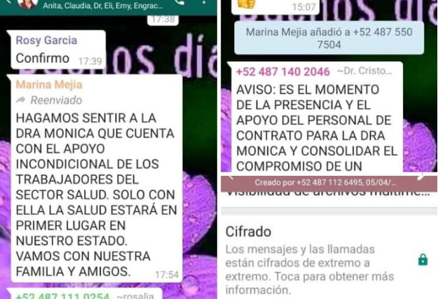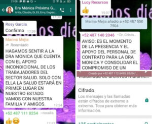 Los grupos de watts apps están cifrados con todos los trabajadores del hospital general de Rioverde en donde aparece la fotografía de la candidata en el avatar y sus administradores invitan a los trabajadores a “sentir a la Dra que cuenta con el apoyo incondicional de los trabajadores dela salud “