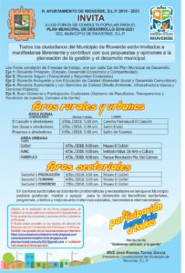 Dió a conocer que los foros constarán de 5 mesas de trabajo, una por cada eje del Plan Municipal de Desarrollo; Rioverde Próspero, Rioverde Seguro, Rioverde Incluyente y con Educación de Calidad, Rioverde Sustentable y con Servicios de Calidad y Buen Gobierno y Participación Ciudadana.