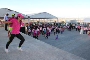 El edificio que alberga las instalaciones de los Servicios de Salud en el Estado, fue el punto de reunión para que autoridades y trabajadores de salud unieran voluntades para sumar acciones que sensibilicen y concienticen a la población sobre el autocuidado como parte fundamental en la lucha contra el cáncer de mama. Como parte del evento, en la explanada principal del edificio se instaló una feria de salud con stands informativos y de orientación, así como actividades lúdicas y recreativas para promover el ejercicio y la alimentación saludable como factores positivos para prevenir el cáncer de la mujer entre los trabajadores de la secretaría de salud y sus familias..