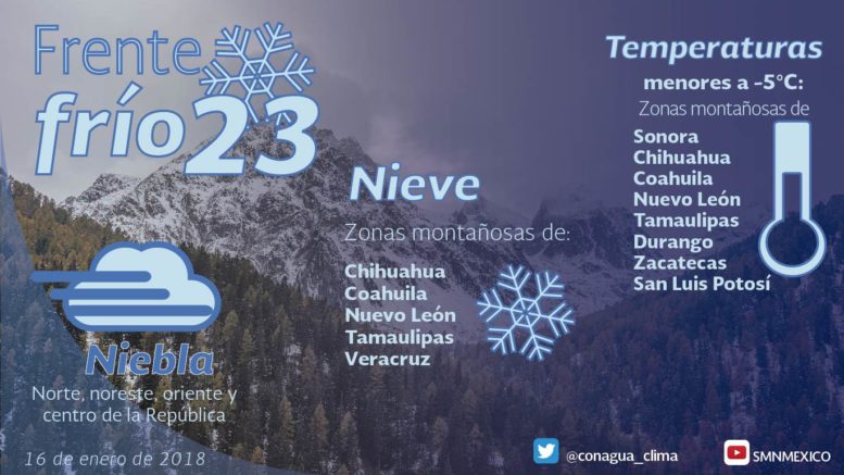 El frente frío número 23 y la masa de aire polar que lo acompaña continuarán generando bajas temperaturas en gran parte del país, incluyendo San Luis Potosí, en donde se pronostica que el termómetro pueda bajar hasta menos 5 grados centígrados (-5°C) dio a conocer la Coordinación Estatal de Protección Civil que pidió a la ciudadanía no bajar la guardia, ya que apenas ha trascurrido la mitad de la temporada de frentes fríos.