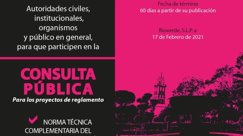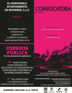 Con la intención de contar con una normatividad efectiva que contribuya a mantener un orden y una mejor convivencia social; las autoridades municipales se encuentran convocando a participar en la Consulta Pública para los Proyectos de Reglamento, de la Norma Técnica Complementaria del Reglamento de Conservación del Centro Histórico de Rioverde, en materia de imagen Urbana, así como del propio Reglamento para la Conservación del Centro Histíorico.