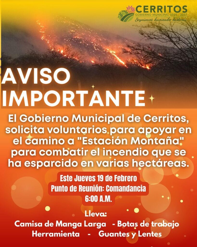 La presidenta municipal de Cerritos, Luz Liliana Castillo Montelongo, informó que este día se registró un incendio forestal en el camino a Montaña, el cual inició a un costado de la carretera y se extendió hacia la zona alta del cerro.