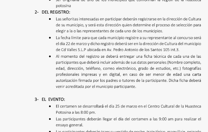 La fecha límite para que cada municipio registrar a su representante al certamen será el día 22 de marzo y dicho registro deberá ser en la dirección de cultura en Ciudad Valles de Pedro Antonio Santos 105 interior 3 a un lado del edificio “La Colmena” a cargo del profesor Salvador Jurado