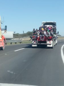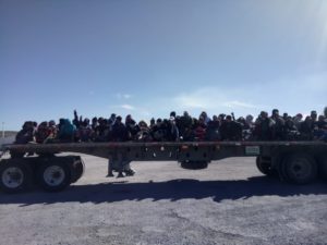 Los primeros 150 migrantes viajaron en un remolque y semiremolque tipo plataforma quienes a su llegada fueron atendidos por los voluntarios de la institución.