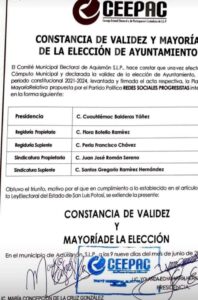 En su perfil de facebook compartió lo siguiente: “Primero quiero agradecer a Dios y a mi familia amigos, liderazgos, y la población en general por haber logrado que hoy en Aquismón demostrara que no es el partido, gano la voluntad y la confianza de la mayoría de la gente; gracias a toda las personas que confiaron en este proyecto va por la gente Pa delante!, se los dijimos al principio, no le pertenecemos a ningún partido nos debemos a ustedes la gente del pueblo.