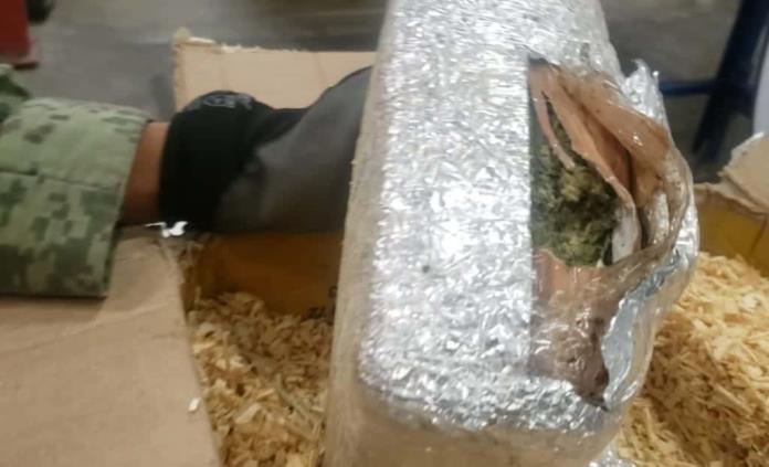 Los hechos ocurrieron cuando el personal militar establecido en un puesto de vigilancia dentro de mencionado aeropuerto, realizó recorridos por el área de paquetería con un binomio canófilo, el cual marcó positivo en una caja de cartón.