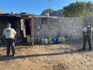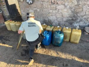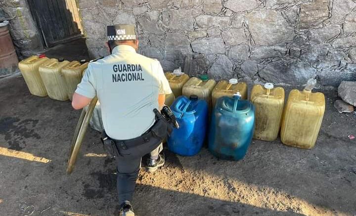 En el municipio de Santa María del Río, San Luis Potosí, elementos de la Guardia Nacional localizan inmueble donde presumiblemente comercializaban hidrocarburo de manera ilegal y aseguran 17 bidones que contenían en su conjunto alrededor de 500 litros de combustible.