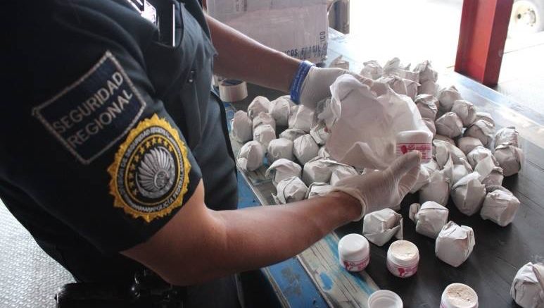 Elementos de la policìa federal asignados al Aeropuerto Internacional Ponciano Arriaga de San Luis Potosí aseguramos siete cajas de cartón, que contenían más de 103 kilogramos de productos que se encuentran dentro del listado de alertas sanitarias emitido por la COFEPRIS