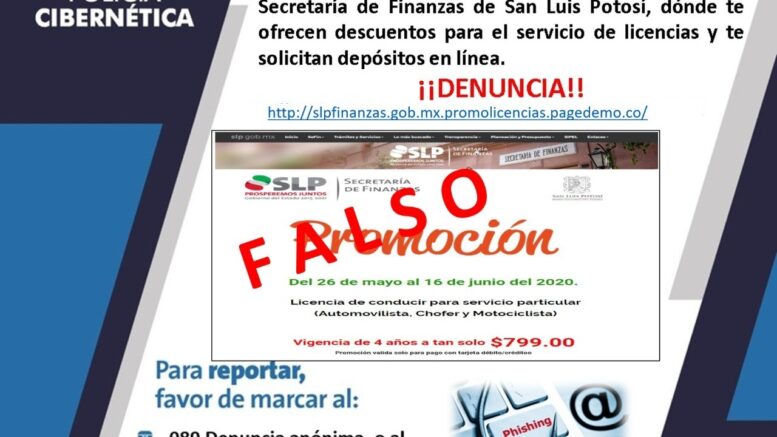 A través de páginas de Facebook así como de mensajes de whatsapp, defraudadores hacen circular una imagen en donde ofrecen licencias de conducir para servicio particular en las modalidades de automovilista, chofer y motociclista, por 4 años a un costo de $799.00. dicha cantidad piden se pague en línea para lo que habilitaron una página falsa http://slpfinanzas.gob.mx.promolicencias.pagedemo.co/