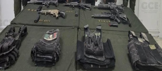 En la intervención, los agentes aseguraron cinco armas largas —cuatro rifles AR-15 y una multicalibre—, cinco cargadores, 75 cartuchos útiles, 12 artefactos poncha llantas y cuatro chalecos tácticos.