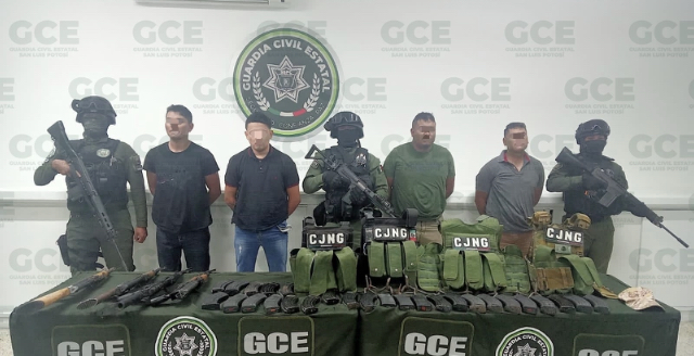La Guardia Civil Estatal desmanteló una célula delictiva en la zona Media de San Luis Potosí, deteniendo a cuatro individuos acusados de varios delitos, incluyendo portación de armas de fuego y posesión de un vehículo robado.