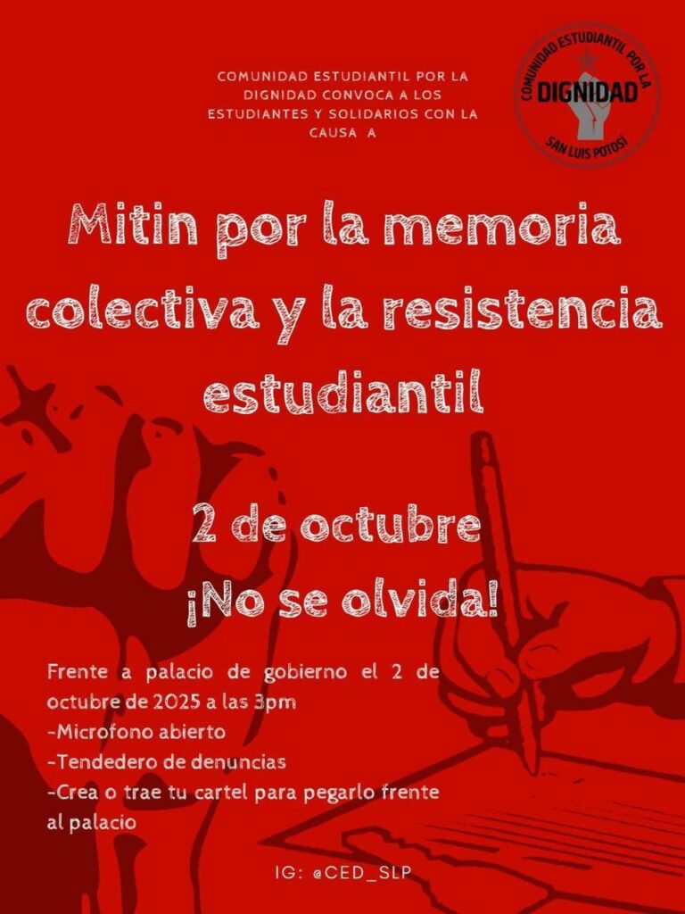 SAN LUIS POTOSÍ, S.L.P. – La comunidad estudiantil de la Universidad Autónoma de San Luis Potosí (UASLP) ha convocado a una gran Marcha Universitaria este día bajo el lema “¡Ni Perdón, Ni Olvido!”. La movilización busca honrar la memoria de los caídos en el movimiento estudiantil de 1968 y, al mismo tiempo, exigir al Gobierno del Estado la liberación inmediata del presupuesto que ha sido retenido a la máxima casa de estudios.