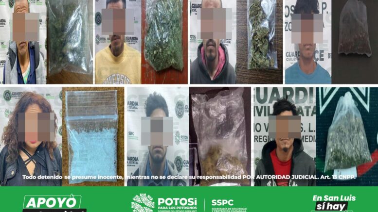 En la colonia Imperio Azteca, Jesús “N” de 32 años fue asegurado con una dosis de marihuana, y Francisco “N” de 27 años fue detenido con una dosis de marihuana. En el municipio de Soledad de Graciano Sánchez, en la colonia 21 de marzo, Martín “N” de 29 años fue detenido con una dosis de marihuana, y en la zona centro, Sergio “N” de 30 años fue detenido con una bolsa de marihuana.