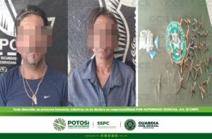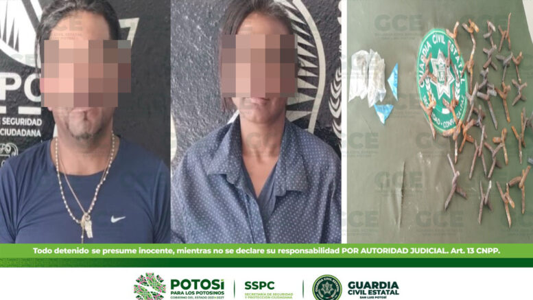Los hechos tuvieron lugar en la localidad Los Ángeles, donde elementos de la GCE detuvieron a Edgar “N” de 37 años de edad y Sandra “N” de 31 años, después de ser detectados en esta zona con dos bolsas con marihuana y dos dosis de “cristal”, además de 30 artefactos de varilla, denominados como “poncha llantas”.