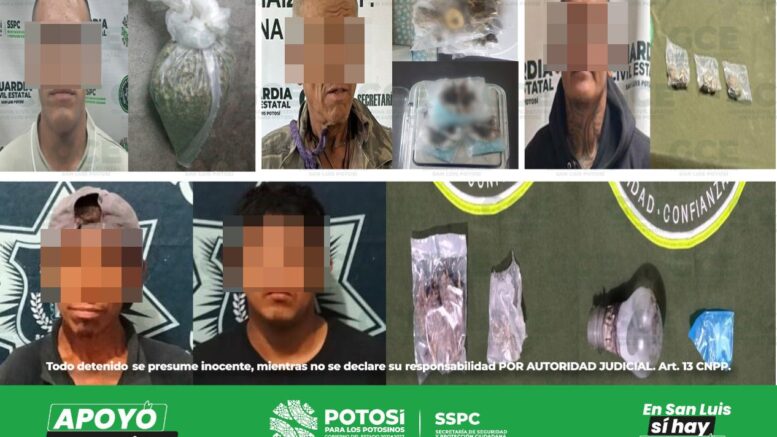 Sobre el municipio de Soledad de Graciano Sánchez, en la zona centro, Cornelio “N” de 40 años de edad, fue remitido a las autoridades con dos dosis de “cristal”; en la colonia Fracción Rivera, Iván “N” de 22 años fue detenido con una dosis de “cristal”; también en la colonia 21 de Marzo, se detectó a José “N” de 40 años con una dosis de marihuana; en la misma zona se detuvo a José “N” de 45 años, tras asegurarle dos dosis de marihuana; también en la colonia Jardines del Valle a Hugo “N” de 50 años y a Julián “N” de 33 años les sorprendieron con dos bolsas que contenían marihuana; Adalid “N” de 30 años de edad, fue detectado en la colonia Ferrocarrilera en probable posesión de una dosis de “cristal”.