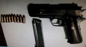 Al realizar una inspección al vehículo se localizó en la parte central entre el conductor y el acompañante un arma de fuego tipo Escuadra marca Yamaha, 9mm abastecida con un cargador con 09 cartuchos de 9mm.