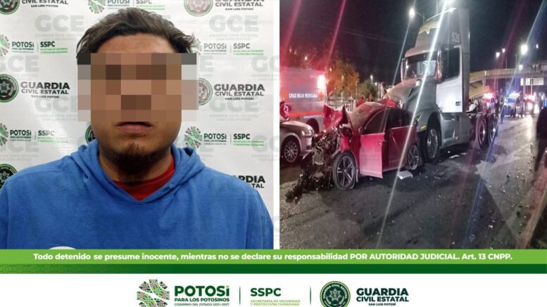 San Luis Potosí, S.L.P.- Un hombre fue detenido por agentes de Guardia Civil Estatal (GCE) luego de que presumiblemente ocasionara lesiones a tres personas, entre ellas una oficial de la corporación estatal, por impactar su unidad de carga en dos vehículos particulares.