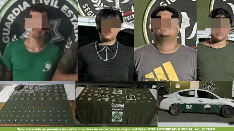 S.L.P.- Acciones contundentes de la Guardia Civil Estatal permitieron la detención de cuatro personas por la presunta venta de droga en la zona Huasteca, asegurándoles 126 dosis de droga.