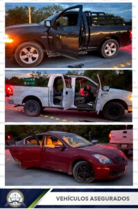 Las personas, los tres vehículos, uno de los cuales tenía reporte de robo, así como los objetos asegurados fueron presentados ante la autoridad competente que definirá su situación jurídica.