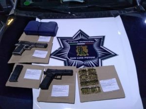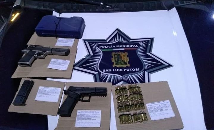 Efectivos de la corporación municipal efectuaron la detención de dos sujetos de 28 y 27 años de edad al ser reportados amenazando a un conductor de taxi con armas de fuego en la zona centro de la capital potosina.