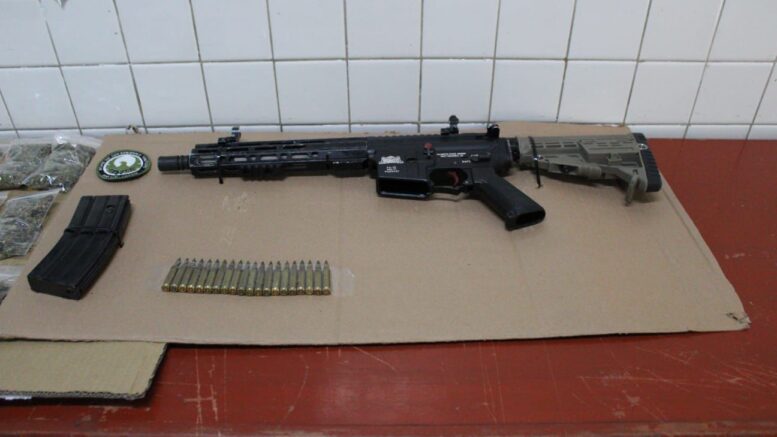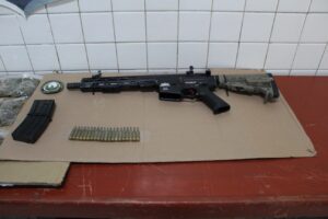 01 arma de fuego tipo fusil de asalto calibre .223 con un cargador abastecido con 20 cartuchos útiles, así como 169 dosis de cristal con un peso de 322 gramos.