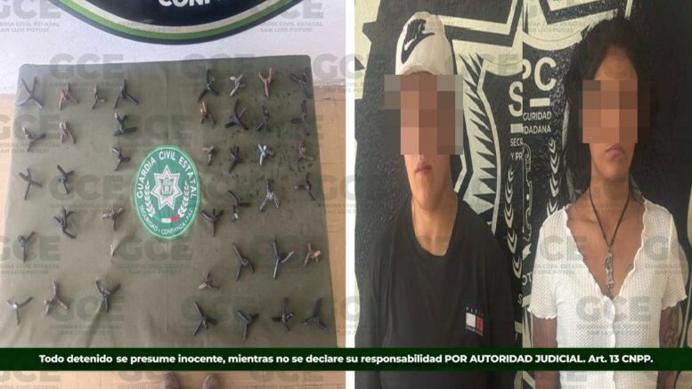 Matehuala, S.L.P.- Elementos de la Guardia Civil Estatal (GCE) lograron la detención de dos mujeres en la zona centro de Matehuala, luego de asegurarles artefactos metálicos conocidos como “poncha llantas”, los cuales presuntamente serían utilizados para obstaculizar labores de las autoridades o realizar actos ilícitos.