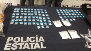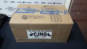 Las unidades policiales logrado asegurar a dos personas del sexo masculino de nombre Enrique N de 25 años quien portaba un chaleco táctico con la leyenda CJNG en su interior 3 bolsa de la droga conocida como CRISTAL y 39 bolsitas en color azul conteniendo en su interior un polvo granulado con las características físicas de la droga conocida como CRISTAL y a la segunda persona de nombre  Pedro N 32 años  quien sostenía una bolsa en color negro conteniendo en su interior dos despensas con una estampa con la leyenda “de parte de sus amigos CJNG”