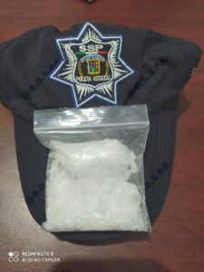 Derivado de la revisión se localizó en el interior del vehículo una bolsa de nylon trasparente conteniendo 16.3 gramos de la droga sintética cristal, por tal motivo fueron detenidos los dos hombres identificados como Gabriel G., de 33 años de edad y Jorge Alberto S., de 34 años de edad, quienes viajaban a bordo de un vehículo Mazda tribute, color negro, modelo 2005, de procedencia americana.