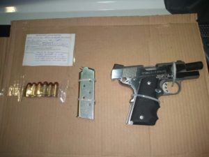 En la revisión le fue asegurado al conductor  en la bolsa delantera lado derecho del pantalón una pistola marca springfield armory calibre 45 abastecida con 6 cartuchos útiles .
