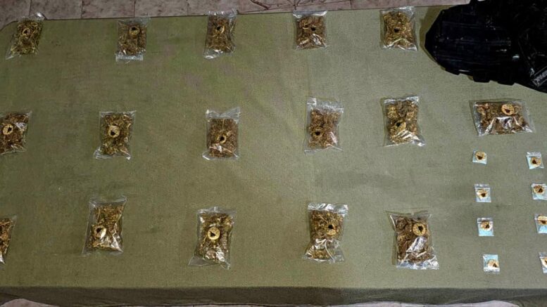 El aseguramiento ocurrió el pasado 2 de octubre alrededor de las 16:15 horas, cuando se detectó a un masculino que portaba una mochila tipo bandolera en color negro con la leyenda Kampak. Al realizar la revisión, los agentes localizaron 16 bolsas de plástico transparente selladas al calor, con estampado dorado y la leyenda “CJNG”, las cuales contenían hierba seca con características de marihuana, además de envoltorios con droga sintética conocida como cristal.