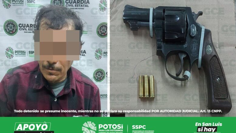 Santa María del Río, S.L.P.- Un reporte atendido en la Línea de Emergencias 911, sobre detonaciones de arma de fuego, alertó a los agentes de Guardia Civil Estatal (GCE), quienes lograron la detención del probable responsable de estos hechos y le aseguraron un arma de fuego.