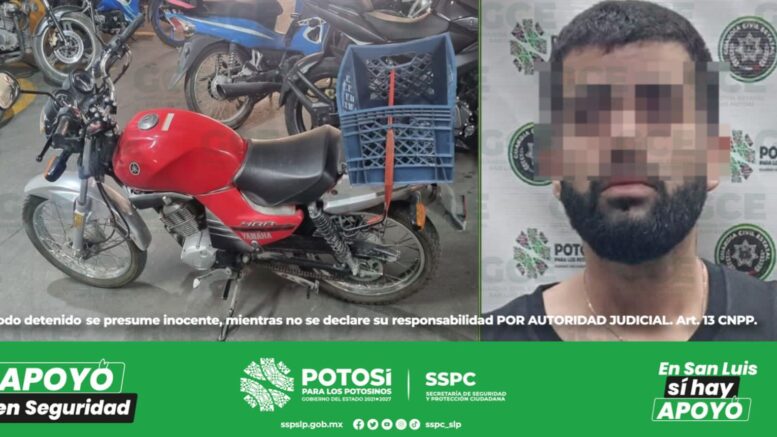 Los hechos se suscitaron en la colonia Jardines de Oriente, Ítalo “N” de 25 años de edad fue detectado a bordo de una motocicleta marca Yamaha, tipo YBR, color rojo, modelo 2022, la cual contaba con reporte de robo del mes de agosto de la colonia Prados Glorieta, en Soledad de Graciano Sánchez.