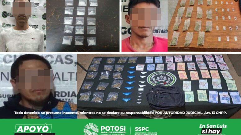 S.L.P.- Como resultado de la reacción inmediata a situaciones que ponen en riesgo la paz y la salud de la ciudadanía potosina, agentes de la Guardia Civil Estatal (GCE) detuvieron a tres probables narcomenudistas, en diferentes hechos, a quienes se les aseguraron 88 dosis de droga.