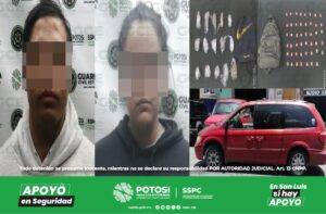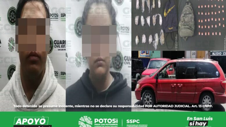 Los presuntos, identificados como Erik “N” de 28 años y Leidy “N” de 30 años de edad, fueron detenidos con una camioneta Chrysler Town Country color rojo, sin placas y una mochila que contenía 15 envoltorios con marihuana en greña, lo anterior con un peso de 372 gramos y una mochila de lona color verde con 47 dosis de “cristal” con un peso de 35.7 gramos.