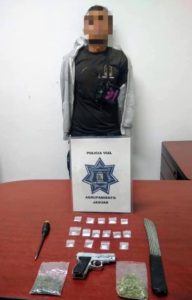 Elementos de la Policía municipal detuvieron a un presunto aletero con droga ,una pistola y objetos punzo cortantes merodeando vehículos estacionados en la vía pública.